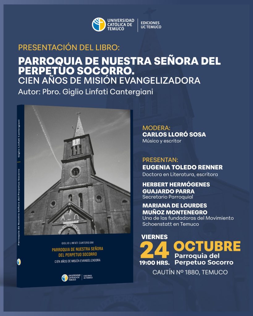 Estimada comunidad, les invitamos al lanzamiento del libro del Padre Giglio Linfati, “Parroquia de Nuestra Señora del Perpetuo Socorro”. 📅 Miércoles 24 de octubre, 2025 🕖 19:00 hrs. 📍 Parroquia Nuestra Señora del Perpetuo Socorro. Cautín #1880, Temuco El libro aborda la historia de la parroquia de Nuestra Señora del Perpetuo Socorro, relatada y documentada […]